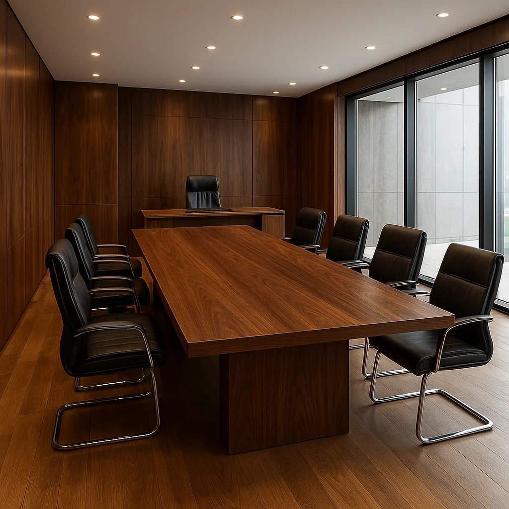 Bàn họp hiện đại/cao cấp: Veneer óc chó/ash sơn PU, Acrylic bóng gương hoặc mặt kính – điểm nhấn sang trọng cho khu vực tiếp khách, phòng giám đốc.